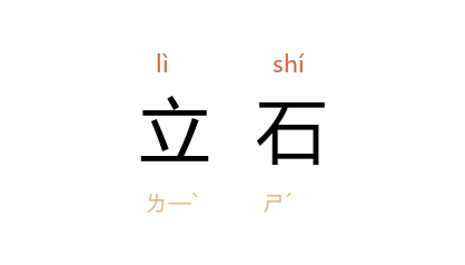 引《史记·秦始皇本纪》:“二十八年, 始皇 东行郡县,上 邹嶧山,立石。”唐 杜甫 《石笋行》:“恐是昔时卿相墓,立石为表今仍存。”《新唐书·张仲武传》:“仲武 表请立石以纪圣功,帝詔 德裕 为铭,揭碑 卢龙,以告后世。”