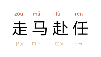 ⒈ 官吏就职。元·无名氏也作「走马上任」。