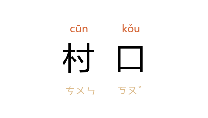 引唐 皎然 《往丹阳寻陆处士不遇》诗:“凤翅山 中思本寺, 鱼竿村 口望归船。”《水浒传》第九回:“﹝ 林冲 等﹞行得三四里路程,见一座小小酒店在村口,四个人入来坐下。”束为 《好人田木瓜》:“在我们 田家沟 村口, 五道庙 背后高圪台上,住着一户人家。”