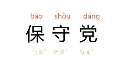 ⒈ 英国的主要政党之一。1833年由托利党转化而成。19世纪60年代起至第一次世界大战,与自由党轮流执政,以后与工党轮流执政。代表大资产阶级和贵族利益。组织机构有保守党议会党团、全国联盟以及青年保守党、妇女保守党、工会保守党等外围组织。