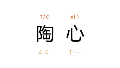 引明 袁宗道 《答刘光州书》:“即今车马棼喧,正陶心煅性之地,自废废人,适维此日。”清 二石生 《十洲春语》卷下:“罔补於政,益增弊端,且自僚幕丁随以下,多以紆门狭巷,为陶心息足之地。”《天雨花》第二五回:“此书岂是闺娃看,部部淫词艳曲文,可知女工全不事,原来以此事陶心。”