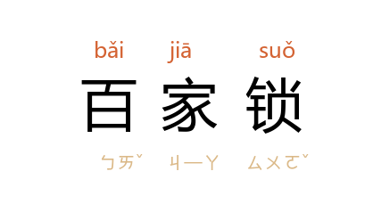 ⒈ 旧俗为婴儿向邻家乞钱,配制锁片,称为「百家锁」。旧时相信婴儿佩戴此锁,可保长命。