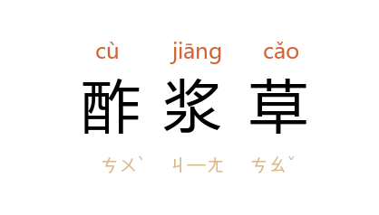 ⒈ 植物名。酢浆草科酢浆草属,多年生匍匐性草本。生原野,小叶三片呈三角形,有长柄,花淡黄色,实为蒴果,熟则绽裂,飞散种子。因茎叶皆有酸味,也称为「酸浆」、「盐酸草」。酢于此义当音ㄘㄨˋ,今俗多混读为ㄗㄨㄛˋ,参见「酢」条。