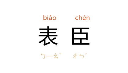 引《书·立政》:“大都小伯、艺人、表臣百司。”孔 传:“小臣犹皆慎择其人,况大都邑之小长,以道艺为表干之臣及百官有司之职,可以非其任乎?”蔡沉 集传:“表,外也。表对里之词。”唐 杜牧 《归融册赠左僕射制》:“实士林之君子,为朝廷之表臣。”唐 柳宗元 《送杨凝郎中使还汴宋诗后序》:“圣上於是抚以表臣,赞以艺人。”