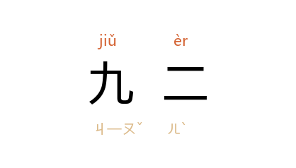 ⒈ 《易》卦爻位名。九,谓阳爻;二,第二爻,指卦象自下而上第二位。 《易·乾》:“九二,见龙在田,利见大人。