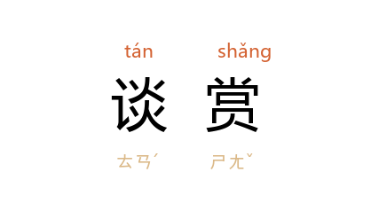 引南朝 宋 刘义庆 《世说新语·雅量》:“谢 与 王 叙寒温数语毕,还与 羊 谈赏, 王 方悟其奇,乃合共语。”《北齐书·邢邵传》:“﹝ 邢邵 ﹞性好谈赏,不能闲独,公事归休,恒须宾客自伴。”《南史·谢灵运传》:“﹝ 谢灵运 ﹞既自以名辈,应参时政,至是唯以文义见接,每侍上宴,谈赏而已。”