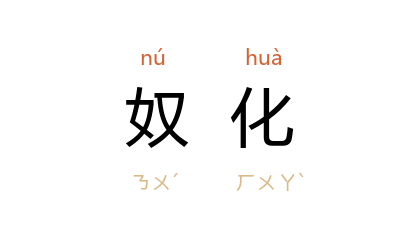 ⒈ 一般指侵略者对其所占领的国家或殖民地,以各种方法使被侵略者丧失民族自尊心,而甘心被奴役。