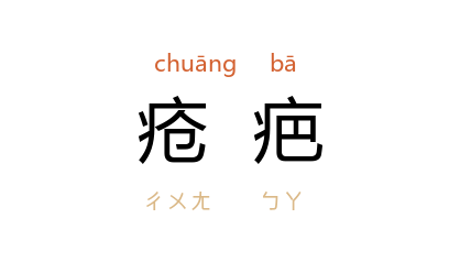 ⒈ 疮伤愈合后留在皮肤上的疤痕。