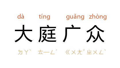 ⒈ 人多而公开的场合。也作「广庭大众@@@广众大庭」。