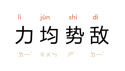 ⒈ 双方力量情势相当,不分上下。也作「力敌势均」、「势均力敌」。