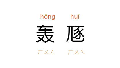引唐 韩愈 《元和圣德诗》:“众乐惊作,轰豗融冶。”祝充 注:“轰,羣车声。豗,相击声。”宋 文天祥 《文山观大水记》:“其声如疾风暴雷,轰豗震荡而不可御。”清 黄景仁 《杂诗》:“南人跨犀象,转鬭声轰豗。”
