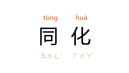⒈ 同受教化。使不相同的事物逐渐变成相近或相同。语音学上指一个音变得与邻近的音相同或相似。如:“面包”(miànbāo)在口语中读miàmbāo,“面”字的韵尾n受后面的“包”字声母b的影响而变成m。