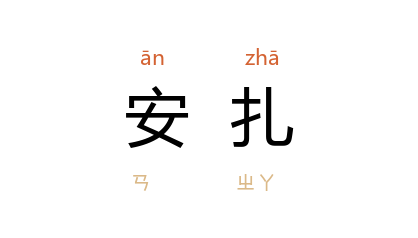 引《西游记·第六回》:「大圣也收了猴兵,安扎在洞门之外。」《喻世明言·卷三九·汪信之一死救全家》:「便请王立在厅侧小阁儿内坐下,差个主管相陪,其余从人俱在门首空房中安扎。」