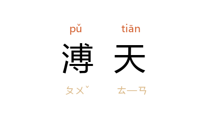 引《诗·小雅·北山》:“溥天之下,莫非王土。”《左传·昭公七年》引作“普天之下”。 唐 玄应 《一切经音义》卷十一:“溥天,今作‘普’,同匹古反。 《诗》云:‘溥天之下。’传曰:‘溥,大也’,亦遍也。”《三国志·吴志·张温传》:“功冒溥天,声贯罔极。”宋 王禹偁 《谢转刑部郎中表》:“荼蓼之情既遵于易月,《蓼萧》之泽遂洽于溥天。”清 唐孙华 《闲居写怀》诗之八:“溥天同偪仄,穷岂独我遭?”