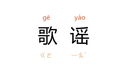 ⒈ 民歌、民谣、儿歌、童谣的统称。古代以合乐为歌,徒歌为谣,现则统称为歌谣。