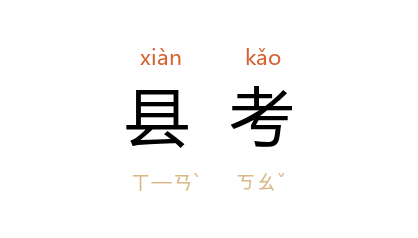 引《儒林外史》第四回:“就如前月县考,把二小儿取在第十名。”清 袁枚 《随园诗话补遗》卷七:“知县 胡公 作宰,忽有马夫,着红布履来告假。问:‘何事?’曰:‘明日要赴县考。’”鲁迅 《呐喊·白光》:“陈士成 看过县考的榜,回到家里的时候,已经是下午了。”
