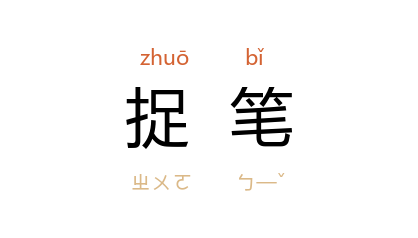 引《三国志·蜀志·许靖传》“歆朗 ……咸与 靖 书” 裴松之 注引 三国 魏 鱼豢 《魏略》载 王朗 与 许靖 书:“捉笔陈情,随以喜笑。”《新唐书·杨师道传》:“捉笔赋诗,如宿构者。”宋 张世南 《<游宦纪闻>序》:“因追思捉笔纪録,不觉盈轴,以《游宦纪闻》题之。”清 顾莼 《高阳台·庚申九日游归田园作》词:“想花围酒阵,舞榭歌廊;捉笔题糕,他时应説清狂。”
