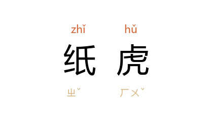 引《水浒传》第二五回:“急上场时,便没些用,见个纸虎,也吓一交。”宁调元 《癸丑狱中作》诗之二:“烂羊满地都如梦,纸虎横空任暂狂。”亦称“纸老虎”。 徐炳昶 《徐旭生西游日记》卷二:“对于内争,或者可以扎个纸老虎,吓吓别人,一旦有外患,结果可不问而知了。”