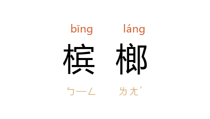 ⒈ 植物名。棕榈科槟榔属,常绿乔木。高三丈多,叶为羽状复叶,干似椰子而细,栽种五年,才能结实,形似肉荳蔻。一干有三、四穗,每穗结实三、四百颗,味涩而微甘。将果实切开,加入石灰、荖花食之,有强齿、消食、健胃的功用。产于东印度等地。也作「宾门」、「宾郎」。