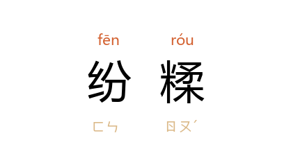 引《楚辞·九辩》:“惟其纷糅而将落兮,恨其失时而无当。”王逸 注:“纷糅,众杂也。”南朝 宋 谢惠连 《雪赋》:“霰淅沥而先集,雪纷糅而遂多。”清 纪昀 《阅微草堂笔记·槐西杂志二》:“其中或符籙、或药方、或人家春联,纷糅无绪,亦间有经书古文诗句。”