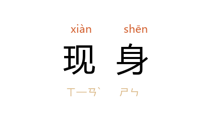⒈ 露面、出现。如:「她一现身,引起在场观众一阵骚动。」