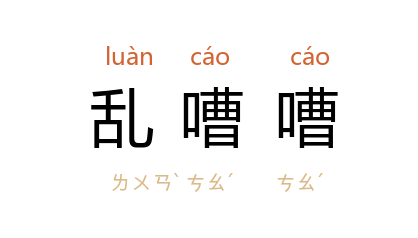 引《说岳全传》第六二回:“那些校尉乱嘈嘈的,正要打进来。”茅盾 《残冬》一:“李根生 拉开了 多多头,好象安慰他似的乱嘈嘈地说道:‘说说罢了,谁去起赃呢!吵什么嘴。’”