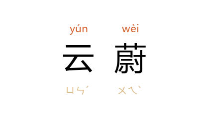 引北魏 郦道元 《水经注·溱水》:“交柯云蔚,霾天晦景。”唐 聂夷中 《公子行》之一:“红楼宴青春,数里望云蔚。”王闿运 《愁霖赋》:“奏才则云蔚,高谈则雷惊。”