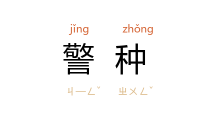 ⒈ 警察的基本类别。一般按其任务分为户籍、交通、消防、治安、刑事、司法、铁道、边防、外事、经济、武装等警种。