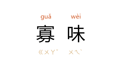 引南朝 梁 锺嵘 《诗品》卷上:“永嘉 时,贵 黄老,稍尚虚谈,於时篇什,理过其辞,淡乎寡味。”明 顾起纶 《国雅品·士品二》:“其文词多寡味。”杜鹏程 《在和平的日子里》第六章:“有时候,他觉得这样苦苦思索和耗费心血实在寡味。”
