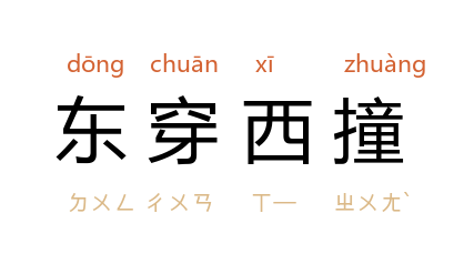 引《隋唐演义·第二六回》:「次日进城中访察,并不见伯当、玄邃二人,亦不晓得那张善士住在何处。东穿西撞,但闻街谈巷语,东一堆西一簇。」