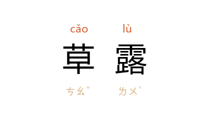 引汉 王粲 《从军诗》之三:“下船登高防,草露霑我衣。”唐 宋之问 《王子乔》诗:“空望山头草,草露溼人衣。”唐 杜甫 《日暮》诗:“石泉流暗壁,草露滴秋根。”