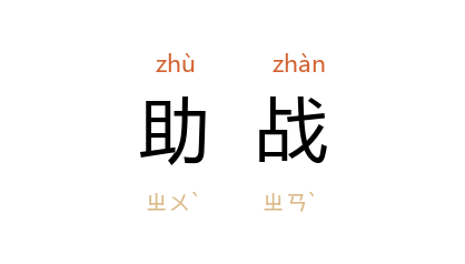 引《三国演义·第五回》:「刘玄德掣双股剑,骤黄鬃马,刺斜里也来助战。」《儒林外史·第三九回》:「只听得山头炮响,你们便喊杀回来助战,不可有误。」