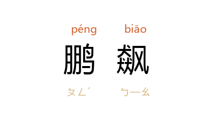 ⒈ 同“鹏飈”。 《庄子.逍遥游》:“﹝鹏﹞抟扶摇而上者九万里。”王先谦集解引《尔雅》:“扶摇谓之飙。”后因以“鹏飙”谓飞鹏所掀起的旋风。比喻伟人的风采。
