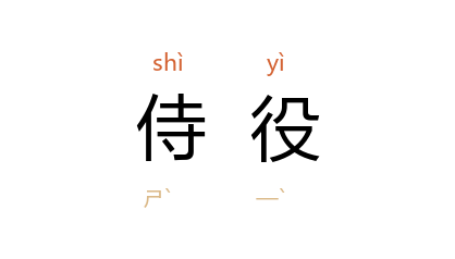 引茅盾 《劫后拾遗》:“餐室里依旧挤得满满的,托着亮晃晃的赛银盘子的侍役们在那些高贵的绅士小姐们中间转来转去,脸上一层油汗。”巴金 《雾》一:“从旅馆里走出两个侍役,都带着恭敬的笑容。”