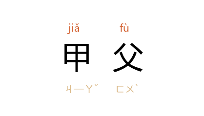 ⒈ 复姓。汉有侍御史甲父沮。见《通志·氏族二》。
