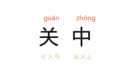 ⒈ 地名。位于今陕西省。东至函谷关,南至武关,西至散关,北至萧关,位于四关之中,故称为「关中」。
