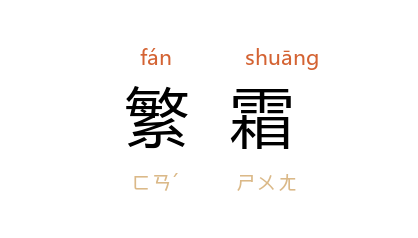 引《诗·小雅·正月》:“正月繁霜,我心忧伤。”汉 张衡 《定情歌》:“大火流兮草虫鸣,繁霜降兮草木零。”唐 戴叔伦 《关山月》诗:“一雁过连营,繁霜覆古城。”鲁迅 《野草·秋夜》:“他的口角上现出微笑,似乎自以为大有深意,而将繁霜洒在我的园里的野花草上。”