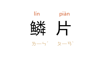 ⒈ 鱼类和爬行动物体表的透明角质小片,排列如覆瓦状。