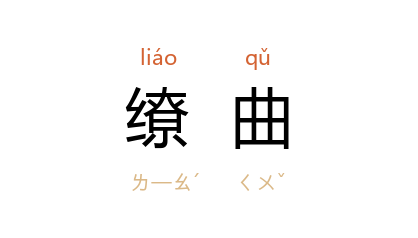 引清 纪昀 《阅微草堂笔记·姑妄听之一》:“有樵者山行遇虎,避入石穴中,虎亦随入。穴故嵌空而繚曲,辗转内避,渐不容虎。”清 刘大櫆 《游晋祠记》:“山之半有寺,凿土为室,繚曲宏丽。”