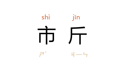 ⒈ 市制重量的主单位。一市斤合五百克。市斤以上有市担,以百进;市斤以下有市两、市钱、市分、市厘、市毫、市丝,均以十进。我国过去长期通行十六两制,一市斤等于十六市两。后改为十两制,一市斤等于十两。通称斤。