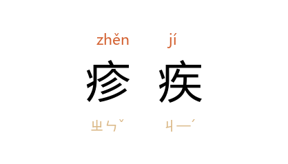 引《艺文类聚》卷八九引 晋 孙楚 《茱萸赋》:“应 神农 之《本草》,疗生民之疹疾。”《周书·裴宽传》:“至于疹疾弥年,亦未尝释卷。”唐 韩愈 《寄崔二十六立之》诗:“况又婴疹疾,寧保躯不貲。”