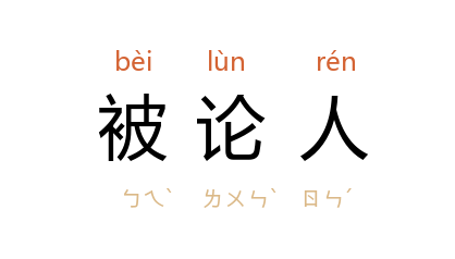 引元 关汉卿 《鲁斋郎》楔子:“被论人有势权,原告人无门下。”元 无名氏 《合同文字》第四折:“只俺这小人不解大人机,把带伤人倒监了十日,干连人不问及,被论人尽勾提。暗暗猜疑,怎参透就中意。”