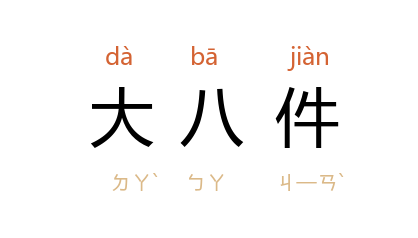 引《相声创作选集·买猴儿》:“第三天一清早晨,五区消费合作社食品部主任来啦,提拉着两包大八件,两包鸡蛋糕。”