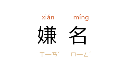 ⒈ 与人姓名字音相近的字。古礼臣子避君父名讳时,不讳声音相近的字。后世讳法加严,讳同字亦讳嫌名。如 汉宣帝 名 询,改 荀卿 为 孙卿 ; 隋文帝 以父名 忠,凡官名有中字者,悉改为内; 唐 李贺 父名 晋肃,当时士大夫认为晋、进音同, 李贺 不该举进士。