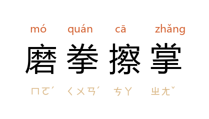 《三国演义·第四九回》:「众兵将得令,一个个磨拳擦掌,准备厮杀。」