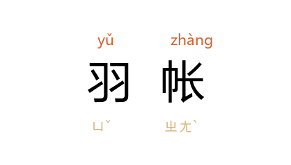 引南朝 宋 鲍照 《拟行路难》之一:“奉君金巵之美酒,瑇瑁玉匣之雕琴,七綵芙蓉之羽帐,九华蒲萄之锦衾。”南朝 梁 萧统 《开善寺法会》诗:“玉树琉璃水,羽帐鬱金牀。”唐 鲍溶 《李夫人歌》:“璿闺羽帐华烛陈,方士夜降夫人神。”
