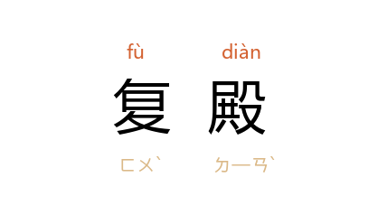 引《乐府诗集·郊庙歌辞八·昭夏乐》:“閟宫黝黝,復殿微微。”详“復庙”。重迭的宫殿。 南朝 齐 谢朓 《落日同何仪曹煦》诗:“参差复殿影,氛氲綺罗杂。”唐 王涯 《宫词》之十二:“鸦飞深在禁城墙,多绕重楼复殿傍。”