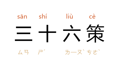 引元 方回 《记游自次前韵》:“尔来何止师左次,三十六策走上策。”林旭 《叔峤印伯居伏魔寺数往访之》诗:“言战言守言迁都,三十六策地则无。”