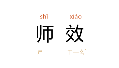 引《书·微子》“卿士师师非度” 唐 孔颖达 疏引 王肃 云:“卿士以下,转相师效,为非法度之事也。”唐 元结 《<箧中集>序》:“凡所为文,皆与时异,故朋友后生,稍见师效,能侣类者有五六人。”清 吴敏树 《与篠岑论文派书》:“文章艺术之有流派,此风气大略之云尔,其间实不必皆相师效,或甚有不同。”