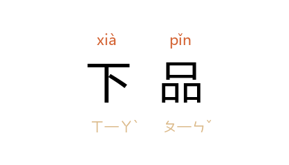 ⒈ 犹下等。 魏 晋 士族门第低的称为下品。 南朝 梁 钟嵘 的《诗品》把 汉 至 齐 梁 的七十二个诗人的作品分为上中下三品。